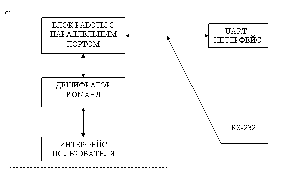 Опишем только часть относящуюся непосредственно к ПК, она обведена на рисунке пунктиром. В программе имеется лишь 3 взаимодействующих блока: интерфейс пользователя, дешифратор команд и блок работы с параллельным портом.