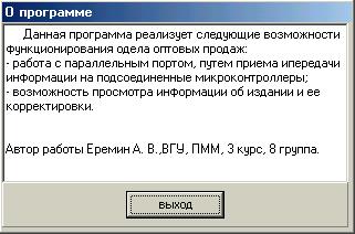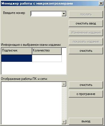 Блок интерфейса пользователя содержит в себе диалог (главное Windows окно программы) пользователя с программой, а также диалоги о корректировки издания (предполагается полное изменение того или иного издания) и информации о программе. Опишем передачу одной команды пошагово.
