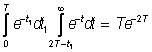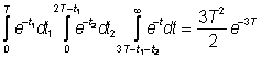 Вероятность того, что будет задержан один самолет, найдем, рассмотрев все задержки одиночных самолетов между двумя незадерживаемыми самолетами. Самолет, который будет задержан, должен прибыть через промежуток времени t1<T после прибытия незадерживаемого самолета, непосредственно предшествующего ему, а незадерживаемый самолет, непосредственно следующий за ним, должен прибыть через промежуток времени t>2T-t1 . Таким образом, искомая вероятность совместного появления этих двух событий равна