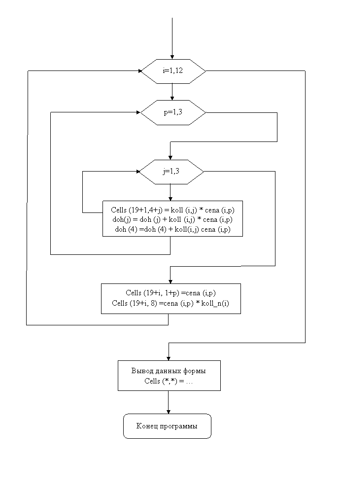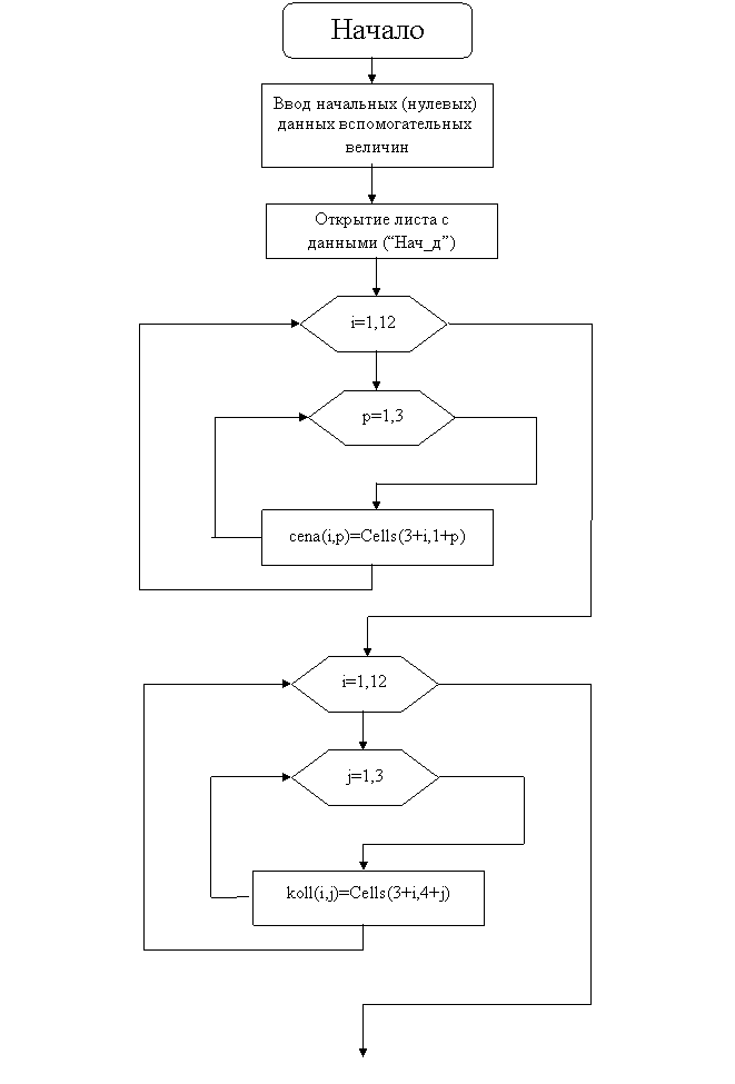 Открытие листа с начальными данными («Нач_д») и получение этих данных в рабочие переменные (двумерные массивы cena (12,3) и koll (12,3)).