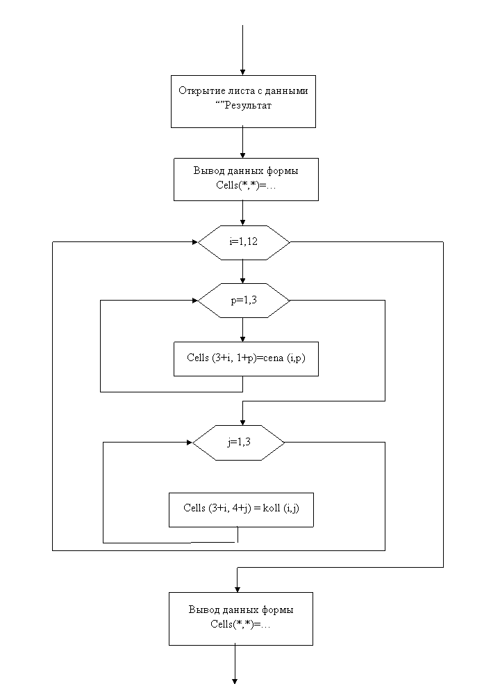Открытие листа с результатами, формирование матрицы входных данных. Организуется два вложенных цикла (по каждой книге и месяцу). Во внутреннем цикле (по месяцам, расчёт по каждому наименованию) суммируется