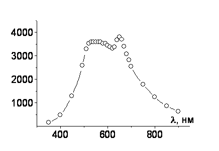 Рис. 2.2. Спектральная чувствительность ячейки для кинетических измерений (дистиллированная вода, нулевой усилитель 358, усиление 7). По оси ординат отложена величина выходного сигнала АЦП.
