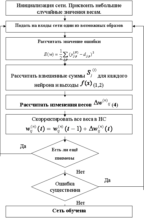 Ниже представлен методика обучения НС с помощью процедуры обратного распространения строится так: