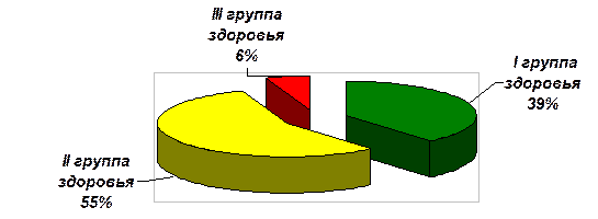 Из данных диаграммы видим, что дети I группы здоровья, то есть здоровые, не страдающие хроническими заболеваниями, имеющие гармоническое, соответствующее возрасту развитие и нормальный уровень физиологических показателей, составляют меньшую часть класса всего 39%.