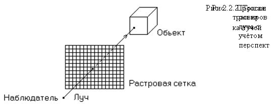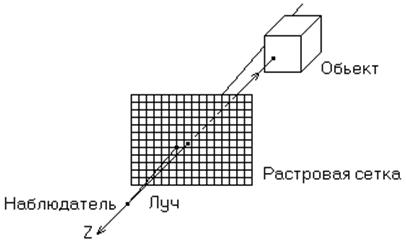 Рис.3.11 служит иллюстрацией алгоритма трассировки лучей. В этом алгоритме предполагается, что сцена уже преобразована в пространство изображения. Перспективное преобразование не используется. Считается, что точка зрения или наблюдатель находится в бесконечности на положительной полуоси z. Поэтому
