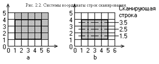 Модификация системы координат сканирующей строки и теста активации устраняет эту проблему, как это показано на рис. 2.8,b. Считается, что сканирующие строки проходят через центр строк пикселов, т. е. через середину интервала, как это показано на рис. 2.8,b. Тест активации модифицируется следующим образом: проверяется, лежит ли внутри интервала центр пиксела, расположенного справа от пересечения. Однако пикселы все еще адресуются координатами левого нижнего угла. Как показано на рис.2.8,b, результат данного метода корректен.