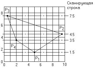 Совсем необязательно, чтобы точки пересечения для строки 4 сразу определялись в фиксированном порядке (слева направо). Например, если многоугольник задаётся списком вершин P1, P2, P3, P4, а список рёбер - последовательными парами вершин P1P2, P2P3, P3P4, P4P5, P5P1, то для строки 4 будут найдены следующие точки пересечения с рёбрами многоугольника: 8, 6, 4, 1. Эти точки надо отсортировать в возрастающем порядке по x, т. е. получить 1,4, 6, 8.