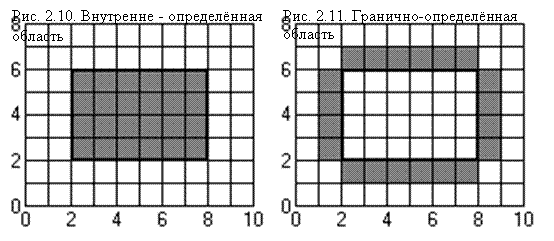 В обсуждавшихся выше алгоритмах заполнение происходит в порядке сканирования. Иной подход используется в алгоритмах заполнения с затравкой. В них предполагается, что известен хотя бы один пиксел из внутренней области многоугольника. Алгоритм пытается найти и закрасить все другие пикселы, принадлежащие внутренней области. Области могут быть либо внутренние, либо гранично-определенные. Если область относится к внутренне - определенным, то все пикселы, принадлежащие внутренней части, имеют один и тот же цвет или интенсивность, а все пикселы, внешние по отношению к области, имеют другой цвет. Это продемонстрировано на рис. 2.10. Если область относится к гранично-определенным, то все пикселы на границе области имеют выделенное значение или цвет, как это показано на рис. 2.11. Алгоритмы, заполняющие внутренне - определенные области, называются внутренне - заполняющими, а алгоритмы для гранично-определённых областей – гранично-заполняющими. Далее будут обсуждаться гранично-заполняющие алгоритмы, однако соответствующие внутренне заполняющие алгоритмы можно получить аналогичным образом.