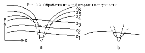 Алгоритм работает очень хорошо до тех пор, пока какая-нибудь очередная кривая не окажется ниже самой первой из кривых. Как показано на рис.3.4,а. Подобные кривые, естественно, видимы и представляют собой нижнюю сторону исходной поверхности. Однако алгоритм будет считать их невидимыми. Нижняя сторона поверхности делается видимой, если модифицировать этот алгоритм, включив в него нижний горизонт, который опускается вниз по ходу работы алгоритма. Это реализуется при помощи второго массива, длина которого равна числу различимых точек по оси x в пространстве изображения. Этот массив содержит наименьшие значения y для каждого значения x. Алгоритм теперь становится таким: