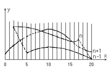 Изложенный алгоритм приводит к некоторым дефектам, когда кривая, лежащая в одной из более удаленных от точки наблюдения плоскостей, появляется слева или справа из-под множества кривых, лежащих в плоскостях, которые ближе к указанной точке наблюдения. Этот эффект продемонстрирован на рис. 3.7, где уже обработанные плоскости n - 1 и n расположены ближе к точке наблюдения. На рисунке показано, что получается при обработке плоскости n + 1. После обработки кривых n - 1 и n верхний горизонт для значений x = 0 и 1 равен начальному значению у; для значений x от 2