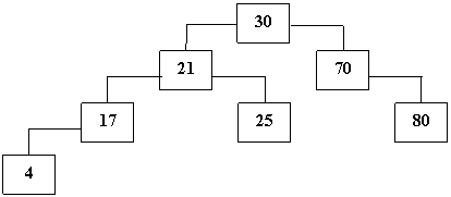 Примером такого отношения может служить отношение "больше- меньше", определяющее структуру бинарного дихотомического дерева. В таком дереве все вершины любого правого поддерева имеют значение информационного поля большее, чем значение такого же поля у корня, а веpшины соответствующего левого поддерева – меньшее. Например, конструирование дихотомического дерева по последовательности целых чисел 30, 70, 80, 21, 25, 17, 4, начиная с 30, должно приводить к созданию следующей структуры: