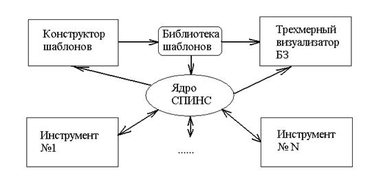 Мы опишем только реализацию ядра системы. Следование принципам открытости предполагает закладывание возможности развития системы через добавление надстроек над ядром (рис. 5.2). Мы, по возможности, старались следовать данному принципу. В частности, одним из направлений развития мы видим создание конструкторов библиотек шаблонов (а, следовательно, и сетей) с помощью ГИП. Предполагается, что выходным продуктом этих конструкторов будут файлы спецификации шаблонов, с которыми уже умеет работать ядро, из которых и будут формироваться библиотеки шаблонов. Далее, можно было бы создать трехмерный визуализатор БЗ (об этом далее), также мы считаем, понадобится отдельный инструмент для конструирования самих БЗ, а, возможно, при определенном уровне сложности блоков УС, и для каждого из них по отдельному инструменту, которые бы учитывали в полной мере специфику блоков УС.