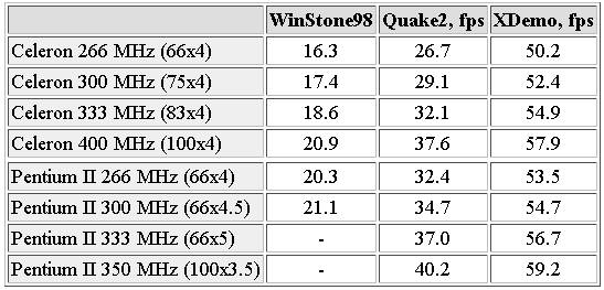 Частота, на которой работает Celeron, составляет 266 МГц при внешней - 66 МГц. Представленная в тот же день 100-мегагерцовая шина новым процессором официально не поддерживается. Кристалл обладает 32 Кбайтами кеш-памяти первого уровня и устанавливается в гнездо Slot 1.