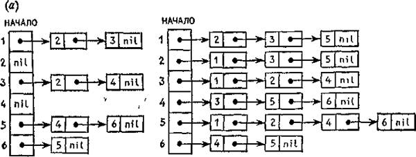 данных, которую мы будем называть списками инцидентности. Она содержит для каждой вершины v C V список вершин и, таких что v -> u (или v — ив случае неориентированного графа). Точнее, каждый элемент такого списка является записью г, содержащей вершину г. строка и указатель г. след на следующую запись в списке (г. след = nil для последней записи в списке). Начало каждого списка хранится в таблице НАЧАЛО; точнее, HAЧАЛО[v] является указателем на начало списка, содержащего вершины из множества {u: v+u} ({u: v - u} для неориентированного графа). Весь такой список обычно неформально будем обозначать 3AПИСЬ[v], а цикл, выполняющий определенную операцию для каждого элемента и из этого списка в произвольной, но четко установленной последовательности, соответствующей очередности элементов в списке, будем записывать «for u C ЗАПИСЬ [v] do .».