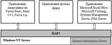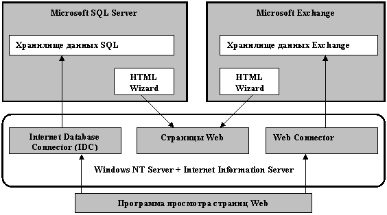 Начиная с версии 4.0 в состав Windows NT входит мощьный Web Internet Information Server (IIS), который реализует также серверы FTP и Gopher. Продукт прост в установке и администрировании. Удобный механизм виртуальных каталогов позволяет физически располагать страницы Web на разных компьютерах (что бывает полезно из соображении безопасности), при этом администратор достаточно легко может манипулировать ими.