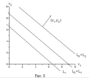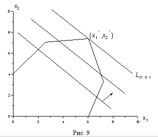 Увеличивая L мы начнем двигать нашу прямую и её пересечение с допустимой областью будет изменяться (см. рис. 7). В конце концов эта прямая выйдет награницу допустимой области - как правило, это будет одна из вершин многоугольника. Дальнейшее увеличение L приведёт к тому, что пересечение