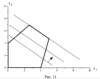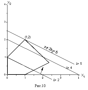 проходит через точки (2,0) и (0,1) и изображена на рис. 8. Будем теперь увеличивать L. Тогда прямая начнёт двигаться параллельно самой себе в направлении, указанном стрелкой. Легко догадаться, что максимальное значение L получится тогда, когда прямая пройдет через вершину многоугольника, указанную на рисунке, и дальнейшее увеличение L приведет к тому, что прямая выйдет за пределы многоугольника и её пересечение с допустимой областью будет пустым.