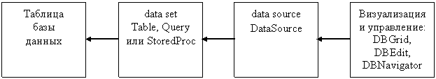 · Компоненты – наборы данных (Data set), непосредственно связывающиеся с базой данных. Для BDE это такие компоненты, как Table, Query, Stored Proc, BDEClientDataSet. Для других технологий имеются аналогичные компоненты наборов данных.