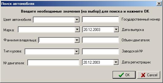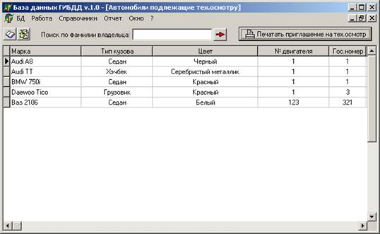 Пункт меню «Работа» содержит в себе следующие подпункты: «Поиск автомобиля» (рис.2) и «Приглашение на тех.осмотр» (рис.3). В первом подпункте ведется поиск, имеется возможность поиска транспортного средства по различным критериям.