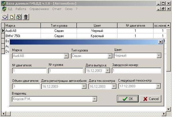 Основным справочником является справочник «Автомобили» (рис.6), здесь сосредоточены данные обо всех автомобилях и их владельцах зарегистрированных в базе данных.