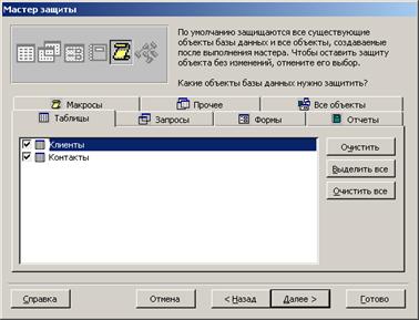 По умолчанию мастер защищает все объекты базы данных. (Access не обеспечивает защиты для страниц доступа к данным, поскольку они хранятся вне файла базы данных.) Вы можете отменить выбор определенных объектов, сняв флажки рядом с их именами. Например, некоторые формы и отчеты вы можете оставить незащищенными, но при этом назначить разрешения на доступ ко всем таблицам и запросам. Щелкните на кнопке Далее.