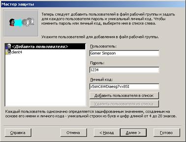 Первое окно диалога содержит краткое описание работы мастера и предоставляет две возможности. Если вы установите верхний переключатель, мастер создаст новый файл рабочей группы, создаст новый код пользователя (не Admin) в этой рабочей группе и затем установит защиту для базы данных, используя эту рабочую группу и нового пользователя. При установке нижнего переключателя (он недоступен, если вы зарегистрировались как пользователь Admin), Access защитит базу данных, используя текущую рабочую группу текущий код пользователя.
