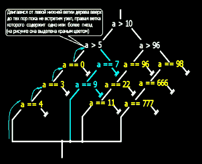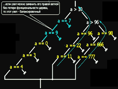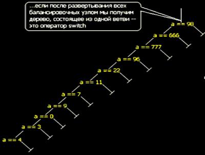 Легко видеть, что узел (a > 2) жестко связан с узлом (a > 1) и работает на пару с последним. Нельзя выкинуть один из них, не нарушив работоспособности другого! Обратить балансировку дерева по описанному выше алгоритму без нарушения его функциональности невозможно! Отсюда может создаться мнение, что имеет место вовсе не оператор множественного выбора, а что-то другое.