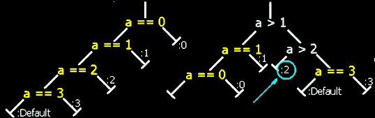 Чтобы развеять это заблуждение придется предпринять ряд дополнительных шагов. Первое - у switch-дерева все case-обработчики всегда находятся на правой ветви. Нужно посмотреть - можно ли трансформировать дерево так, чтобы case-обработчик 2 оказался на левой ветви балансировочного узла? Оказывается, можно: заменив (a > 2) на (a < 3) и поменяв ветви местами (другими словами выполнив инверсию). Второе - все гнезда switch-дерева содержат в себе условия равенства, - смотрим: можно ли заменить неравенство (a < 3) на аналогичное ему равенство? Да, можно - (a == 2)!