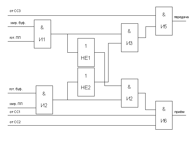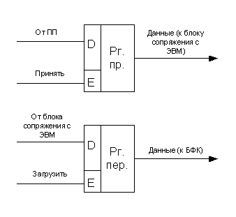 Буфер данных (рис. 6) представляет собой два регистра: регистр приёма и регистр передачи. В регистр приёма загружаются данные по команде «принять» блока управления. В регистр передачи загружаются данные для передачи в сеть по внешней команде «загрузить».