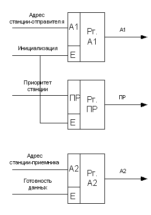 Блок формирования кадра (рис. 8) состоит из четырех регистров. Регистры адреса включаются на загрузку по команде «сформировать кадр данных» и на их вход данных поступают адреса станции-отправителя и станции-приёмника, а также приоритет станции. Регистр данных загружается данными для передачи по команде «сформировать кадр данных».