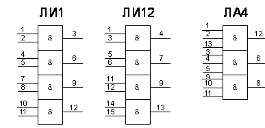 Микросхемы типа ЛА выполняют логическую функцию «И-НЕ», а ИС типа ЛИ - логическую функцию «И». Условные обозначения и цоколёвки микросхем типа ЛА и ЛИ показаны на рис. 11.