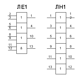 Микросхемы типа ЛЕ выполняют логическую функцию «ИЛИ-НЕ», микросхемы типа ЛН представляют собой инверторы и выполняют логическую операцию «НЕ». Их условные обозначения и цоколёвка представлены на рис.12.
