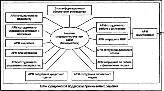 Блок информационного обеспечения руководства предназначается для поддержки и принятия решений руководства банка и формирует аналитическую информацию по результатам деятельности банка. Обычно этот блок выполняется в виде АРМ, который реализует получение сведений о ликвидности банка и другой стратегической информации, а также данных о состоянии счетов, архивных справок и пр.