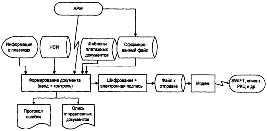Для обеспечения взаимодействия по схеме клиент-банк у клиента устанавливается программный комплекс АРМ клиента, который позволяет вводить, редактировать платежные документы с использованием типового набора бланков, печатать подготовленные документы, шифровать и дешифровать информацию и обеспечивать авторизацию через механизм электронной подписи, отправлять и принимать документы, файлы и сообщения. В банке внутри базового блока устанавливается для взаимодействия с клиентом АРМ банка. Этот комплекс обеспечивает через АРМ коммуникаций аналогичные функции по взаимодействию с клиентом, поддерживает архивы взаимодействия с клиентом и отправляет поступившие платежные документы по ЛВС на обработку в нужный АРМ.