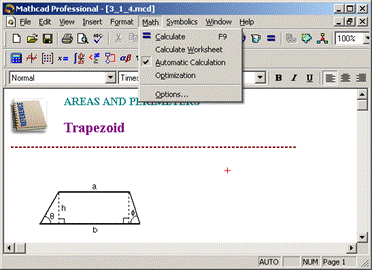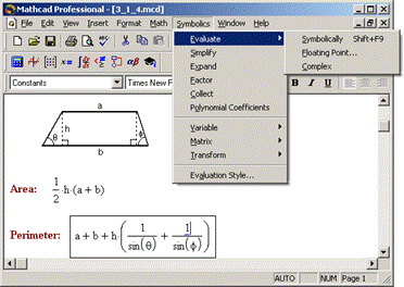 Математический интерпретатор системы - наиболее интересная её часть. Математические формулы, подлежащие интерпретации, записываются в общепринятом виде. Например, вычисление квадратного корня из двух в системе MathCAD задаётся как √2 =, а не в виде PRINT SQR (2) , как это делается, скажем, на Бейсике. Для ввода формул используются шаблоны, вводимые определёнными комбинациями клавиш. Имеется возможность изменения формата представления чисел, например числа знаков после разделительной точки, погрешности вычислений и обозначения мнимой единицы (i на j и наоборот) при операциях с комплексными числами.