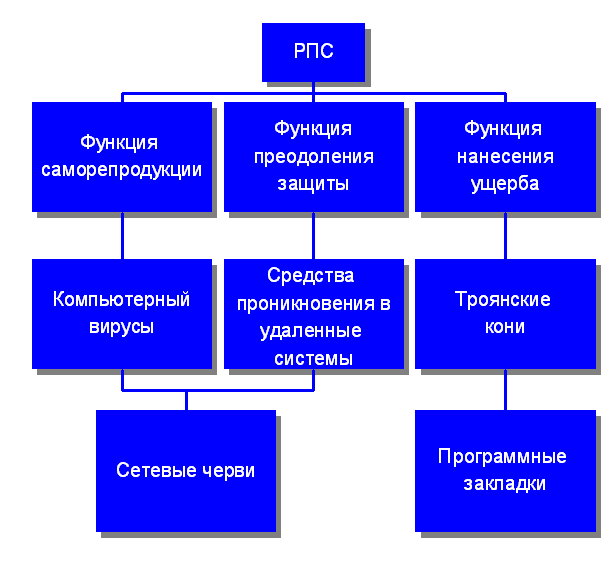 Класс РПС составляют компьютерные вирусы, троянские кони (закладки) и средства проникновения в удаленные системы через локальных и глобальных сетей (рис. 5).