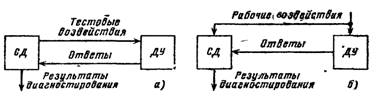 Различают системы тестового и функционального диагностирования. В системах тестового диагностирования воздействия на диагностируемое устройство (ДУ) поступают от средств диагностирования (СД). В системах функционального диагностирования воздействия, поступающие на ДУ, заданы рабочим алгоритмом функционирования. Обобщенные схемы систем тестового и функционального диагностирования показаны на рис. 1.