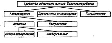 В средних и больших ЭВМ используются, как правило, встроенные (специализированные) средства диагностирования. В микро-ЭВМ чаще используются встроенные средства подачи тестовых воздействий в внешние универсальные средства (например, сигнгатурные анализаторы) для снятия ответов и анализа результатов.