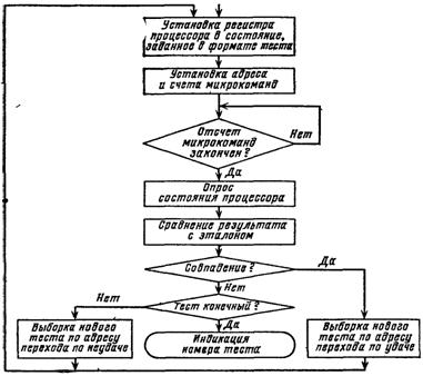 С помощью тестов единичного цикла проверяются комбинационные схемы. Их последовательность определяется условным алгоритмом диагностирования. Тесты комбинационных схем выполняются следующим образом: с помощью операции установки в регистре процессора, расположенном на входе проверяемой комбинационной схемы, задается состояние, соответствующее входному тестовому воздействию. Выполняется микрооперация приема выходного сигнала комбинационной схемы в регистр расположенный на выходе комбинационной; схемы; Состояние этого регистра записывается в диагностическую область ОП, а затем сравнивается с эталонным. В зависимости от исхода теста выполняется переход к следующему тесту При обнаружении неисправности индицируется .номер теста. В диагностическом справочнике тестов единичного цикла указаны не только подозреваемые ТЭЗ, но и значения сигналов на входах, промежуточных точках и выходах комбинационной схемы. Такая подробная информация дозволяет уточнить локализацию до монтажных связей или микросхем. На следующих стадиях диагностирования, использующих другие методы диагностирования, проверяются мультиплексный и селекторный каналы, а также функциональные средства ЭВМ с помощью тест-секций диагностического монитора.