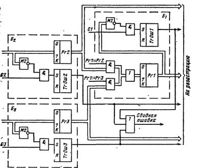 Для пояснения метода диагностирования по регистрации состояния рассмотрим схему, показанную на рис, 22. Эта схема размещена в трех разных блоках б1-бз. Выходы регистров Pгl — РгЗ. триггеров ошибок Тг0ш1 — ТгОшЗ, а также состояние регистра микрокоманд (на схеме не показав) поступают на регистрацию состояния.