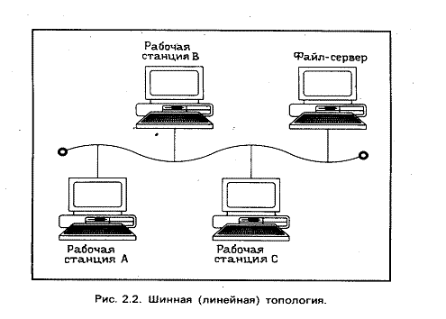 Топология "общая шина" предполагает использование одного кабеля, к которому подключаются все компьютеры сети (рис. 2.2). В случае "общая шина" кабель используется совместно всеми станциями по очереди. Принимаются специальные меры для того, чтобы при работе с общим кабелем компьютеры не мешали друг другу передавать и принимать данные.