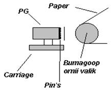 Матричные принтеры - наиболее распространенный тип принтеров. Идея матричных печатающих устройств заключается в том, что требуемое изображение воспроизводится из набора отдельных точек, наносимых на бумагу. В этом типе принтеров используется для печати печатающая головка(ПГ) , которая содержит одни или два ряда тонких игл. Головка устанавливается на ракетке и движется вдоль печатаемой строки. При этом иголки в нужный момент ударяют через красящую ленту по бумаге. Это обеспечивает формирование на бумаге символов и изображений. В дешевых моделях принтеров используются ПГ с 9 иглами. Качество печати в этих принтерах улучшается при печати информации не в один, а в два или четыре прохода ПГ вдоль печатаемой строки. Более качественная и быстрая печать обеспечивается 24-иголочными принтерами. Однако эти принтеры более дороги по сравнению с 9-иголочными,менее надежны .