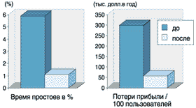 Рисунок 3. Сокращение времени простоев и снижения продуктивности работы пользователей (в процентах) и потери прибыли из-за простоев - до и после реализации Unicenter