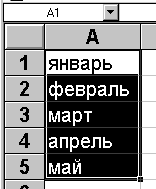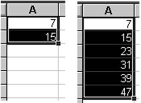 В ячейку вводится первый член ряда. Указатель мыши подвести к черному квадрату в правом нижнем углу выделенной ячейки (в этот момент белый крестик переходит в черный) и нажать левую кнопку мыши. Удерживая нажатой кнопку мыши, выделите нужную часть строки или столбца. Выделенная область заполнится данными.