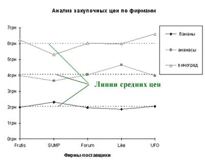 Линии средних цен нужно отформатировать иначе, чем это делает мастер. Их нужно сделать того же цвета, что и линии закупочных цен, убрать маркеры и сделать пунктирными.