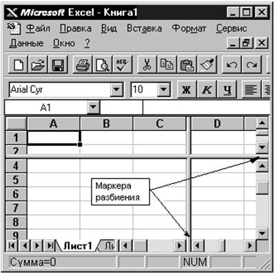 Команда Разбить разбивает активное окно на два или четыре подокна. Эта команда позволяет прокручивать подокна одновременно. Два горизонтальных подокна всегда будут иметь одинаковые заголовки столбцов; два вертикальных подокна всегда будут иметь одинаковые заголовки строк.
