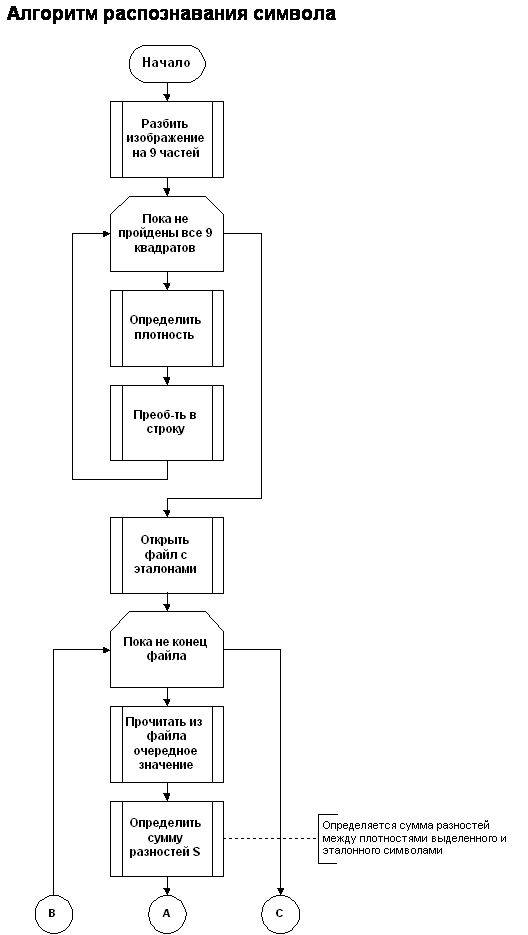 . Определяется и складываются между собой разности между плотностями эталонного и выделенного символами для каждого квадрата. Тот эталонный символ, у которого полученная сумма окажется наименьшей считается эквивалентом для выделенного.