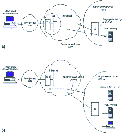 В первом случае (рисунок 4.1, a) программное обеспечение, установленное на компьютере удаленного клиента, устанавливает защищенный канал с сервером корпоративной сети, к ресурсам которого клиент обращается. Преимуществом этого подхода является полная защищенность канала вдоль всего пути следования, а также возможность использования любых протоколов создания защищенных каналов, лишь бы на конечных точках канала поддерживался один и тот же протокол. Недостатки заключаются в избыточности и децентрализованности решения. Избыточность состоит в том, что уязвимыми для злоумышленников обычно являются сети с коммутацией пакетов, а не каналы телефонной сети или выделенные каналы. Поэтому установка специального программного обеспечения на каждый клиентский компьютер и каждый сервер корпоративной сети не является необходимой. Децентрализация процедур создания защищенных каналов не позволяет вести централизованное управление доступом к ресурсам сети. В большой сети необходимость отдельного администрирования каждого сервера и каждого клиентского компьютера с целью конфигурирования в них средств защиты данных - это трудоемкая процедура.