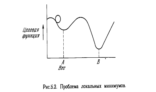 Этот процесс стремится минимизировать целевую функцию, но может попасть, как в ловушку, в неудачное решение. На рис. 5.2 показано, как это может иметь место в системе с единственным весом. Допустим, что первоначально вес взят равным значению в точке А. Если случайные шаги по весу малы, то любые отклонения от точки А увеличивают целевую функцию и будут отвергнуты. Лучшее значение веса, принимаемое в точке В, никогда не будет найдено, и система будет поймана в ловушку локальным минимумом, вместо глобального минимума в точке В. Если же случайные коррекции веса очень велики, то как точка А, так и точка В будут часто посещаться, но то же самое будет иметь место и для каждой другой точки. Вес будет меняться так резко, что он никогда не установится в желаемом минимуме. Полезная стратегия для избежания подобных проблем состоит в больших начальных шагах и постепенном уменьшении размера среднего случайного шага. Это позволяет сети вырываться из локальных минимумов и в то же время гарантирует .окончательную стабилизацию сети. Ловушки локальных минимумов досаждают всем алгоритмам обучения, основанным на поиске минимума, включая персептрон и сети обратного распространения, и представляют серьезную и широко распространенную трудность, которой часто не замечают. Стохастические методы позволяют решить эту проблему. Стратегия коррекции весов, вынуждающая веса принимать значение глобального оптимума в точке В, возможна. В качестве объясняющей аналогии предположим, что на рис. 5.2 изображен шарик на поверхности в коробке. Если коробку сильно потрясти в горизонтальном направлении, то шарик будет быстро перекатываться от одного края к другому. Нигде не задерживаясь, в каждый момент шарик будет с равной вероятностью находиться в любой точке поверхности. Если постепенно уменьшать силу встряхивания, то будет достигнуто условие, при котором шарик будет на короткое время «застревать» в точке В. При еще более слабом встряхивании шарик будет на короткое время останавливаться как в точке А, так и в точке В. При непрерывном уменьшении силы встряхивания будет достигнута критическая точка, когда сила встряхивания достаточна для перемещения шарика из точки А в точку В, но недостаточна для того, чтобы шарик мог вскарабкаться из В в А. Таким образом, окончательно шарик остановится в точке глобального минимума, когда амплитуда встряхивания уменьшится до нуля.