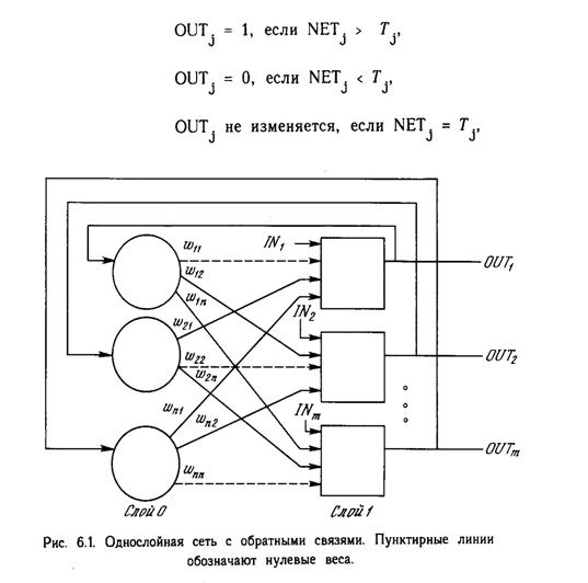 На рис. 6.1 показана сеть с обратными связями, состоящая из двух слоев. Способ представления несколько отличается от использованного в работе Хопфилда и других, но эквивалентен им с функциональной точки зрения, а также хорошо связан с сетями, рассмотренными в предыдущих главах. Нулевой слой, как и на предыдущих рисунках, не выполняет вычислительной функции, а лишь распределяет выходы сети обратно на входы. Каждый нейрон первого слоя вычисляет взвешенную сумму своих входов, давая сигнал NET, который затем с помощью нелинейной функции F преобразуется в сигнал OUT. Эти операции сходны с нейронами других сетей (см. гл.2).